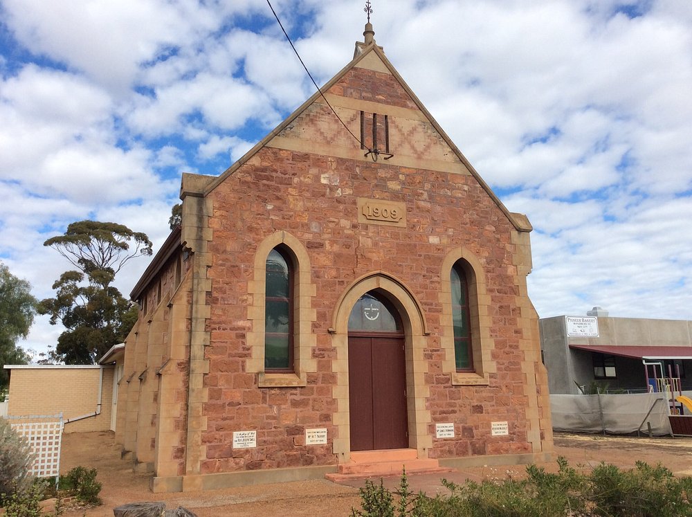 This simple Victorian Gothic style church was built in 1909 of locally quarried stone with sandstone Quoins (cornerstones). It has a corrugated iron roof and wooden floors and the front wall features decorated brickwork. Reverend Joseph Snell officiated at the founding on 15 September 1909.