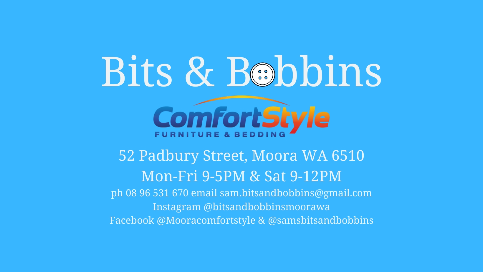 Business Listing for Bits & Bobbins Art & Culture, Shop (08) 9653 1670 sam.bitsandbobbins@gmail.com https://bitsandbobbins.square.site/ 52 Padbury St Moora WA 6510 Additional Information Follow Us on Facebook Second Website: Second Website Follow Us on Instagram Features: We are a quirky country shop filled with all things sewing, craft, home-wares, gifts and furniture. Bits and Bobbins: Art supplies, craft supplies, haberdashery supplies, kids craft kits, yarn, fabric, crochet kits, embroidery supplies. ComfortStyle Furniture & Bedding Moora: value furniture, lounges, sofas, beds, mattresses and more. Opening Hours: Monday to Friday: 9am – 5pm, Saturday: 9am -12pm We are a quirky country shop filled with all things sewing, craft, home-wares, gifts and furniture. Images Bits Bobbins 4 Bits Bobbins 5 Bits Bobbins 6 Bits Bobbins 7 Bits and Bobbins new Bits Bobbins 2 Bits Bobbins 3