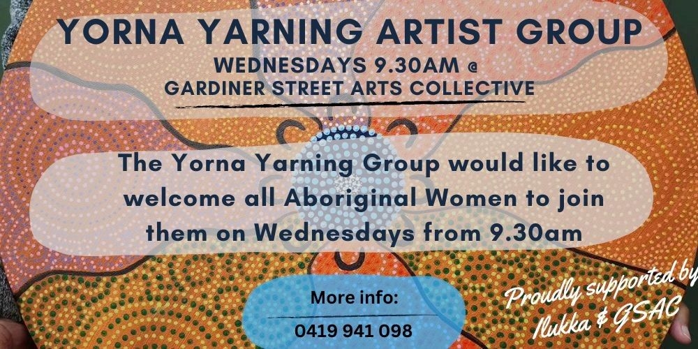 Business Listing for Yorna Yarning, on Wednesdays at GSAC Art & Culture, Things To Do 0417 096 365 coordinator@gardinerstreetartscollective.com.au Gardiner Street Arts Collective, 7 Gardiner St Moora Additional Information Follow Us on Facebook Description: Yorna Yarning Artist Group. Pop by for a yarn and connection. All aboriginals on Yued Noongar Booja are welcome to join this creative group. Come tell your stories, connect, and collaborate. Paints are supplied. Opening Hours: Wednesdays from 10.00am For more information:: See the GSAC Facebook page, or email coordinator@gardinerstreetartscollective.com.au or contact Nyree on 0417 096 365 Images Jades artwork