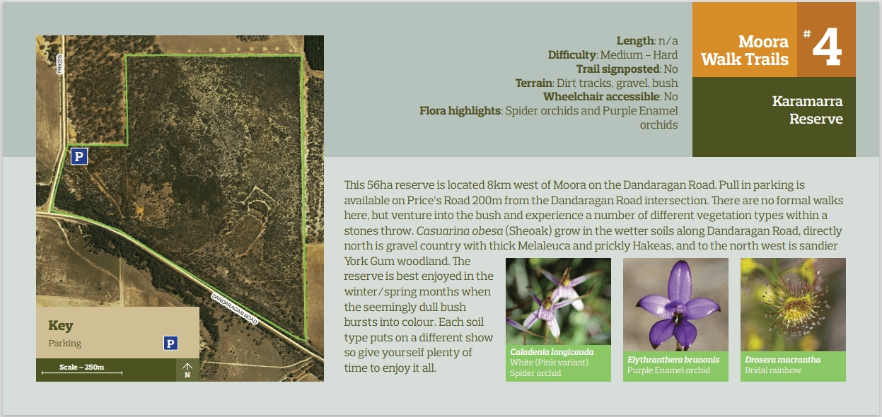 Business Listing for Moora Walk Trails: Karamarra Reserve Attractions, Hikes, Trails & Wildflowers, Things To Do Additional Information Description: This 56ha reserve is located 8km west of Moora on the Dandaragan Road. Pull in parking is available on Price’s Road 200m from the Dandaragan Road intersection. There are no formal walks here, but venture into the bush and experience a number of different vegetation types within a stones throw. Casuarina obesa (Sheoak) grow in the wetter soils along Dandaragan Road, directly north is gravel country with thick Melaleuca and prickly Hakeas, and to the north west is sandier York Gum woodland. The reserve is best enjoyed in the winter/spring months when the seemingly dull bush bursts into colour. Each soil type puts on a different show so give yourself plenty of time to enjoy it all. Features: Length: n/a, Difficulty: Medium – Hard, Trail signposted: No, Terrain: Dirt tracks, gravel, bush, Wheelchair accessible: No, Flora highlights: Spider orchids and Purple Enamel orchids, Download the Walks in the Shire of Moora Eco Trails brochure here: https://www.moora.com.au/wp-content/uploads/2021/04/Walks-in-the-Shire-of-Moora.pdf Images Flowers Moora 2 Screenshot 2024 04 02 143605