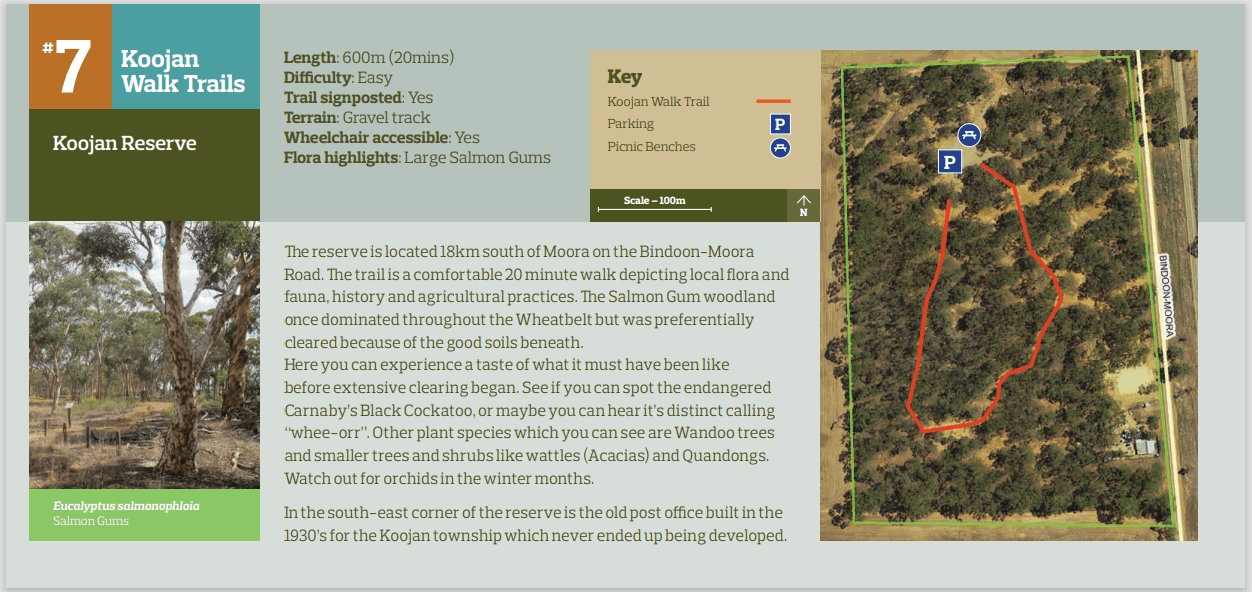 Business Listing for Koojan Walk Trails: Koojan Reserve Attractions, Hikes, Trails & Wildflowers, Things To Do https://moora.com.au/documents/976/walks-in-the-shire-of-moora Additional Information Description: The reserve is located 18km south of Moora on the Bindoon-Moora Road. The trail is a comfortable 20-minute walk depicting local flora and fauna, history and agricultural practices. The Salmon Gum woodland once dominated throughout the Wheatbelt but was preferentially cleared because of the good soils beneath. Here you can experience a taste of what it must have been like before extensive clearing began. See if you can spot the endangered Carnaby’s Black Cockatoo, or maybe you can hear it’s distinct calling “whee-orr”. Other plant species which you can see are Wandoo trees and smaller trees and shrubs like wattles (Acacias) and Quandongs. Watch out for orchids in the winter months. In the south-east corner of the reserve is the old post office built in the 1930’s for the Koojan township which never ended up being developed. Features: Length: 600m (20mins) Difficulty: Easy Trail signposted: Yes Terrain: Gravel track Wheelchair accessible: Yes Flora highlights: Large Salmon Gums Download the Walks in the Shire of Moora Eco Trails brochure here: https://moora.com.au/documents/976/walks-in-the-shire-of-moora Images Screenshot 2024 04 02 152041 Koojan Walk Trails