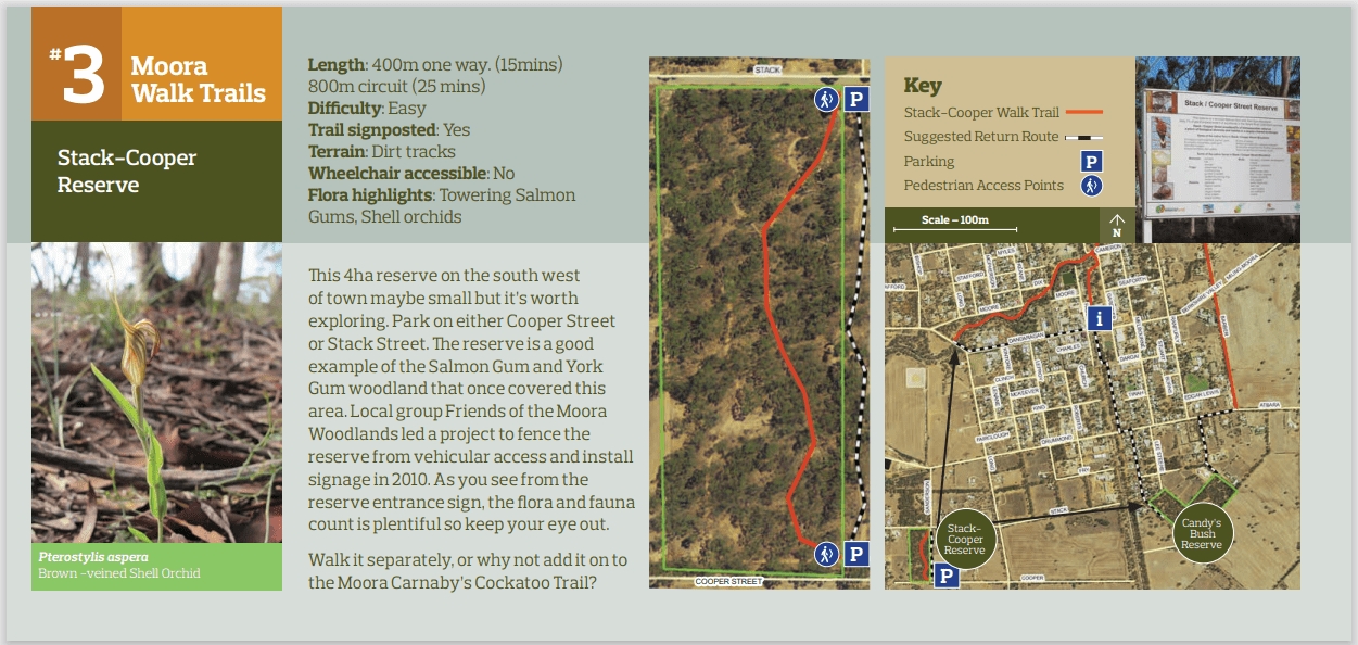 Business Listing for Moora Walk Trails: Stack-Cooper Reserve Attractions, Hikes, Trails & Wildflowers, Things To Do https://moora.com.au/documents/976/walks-in-the-shire-of-moora Additional Information Description: This 4ha reserve on the south-west of town may be small but it’s worth exploring. Park on either Cooper Street or Stack Street. The reserve is a good example of the Salmon Gum and York Gum woodland that once covered this area. Local group Friends of the Moora Woodlands led a project to fence the reserve from vehicular access and install signage in 2010. As you see from the reserve entrance sign, the flora and fauna count is plentiful so keep your eye out. Walk it separately, or why not add it on to the Moora Carnaby’s Cockatoo Trail? Features: Length: 400m one way. (15mins); 800m circuit (25 mins) Difficulty: Easy Trail signposted: Yes Terrain: Dirt tracks Wheelchair accessible: No Flora highlights: Towering Salmon Gums, Shell orchids Download the Walks in the Shire of Moora Eco Trails brochure here: https://moora.com.au/documents/976/walks-in-the-shire-of-moora Images FLowers Moora Screenshot 2024 04 02 142648