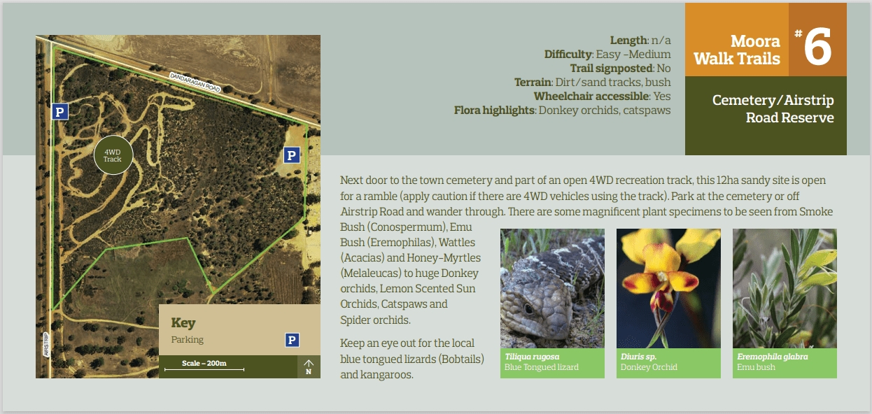Business Listing for Moora Walk Trails: Cemetery / Airstrip Road Reserve Attractions, Hikes, Trails & Wildflowers, Things To Do https://moora.com.au/documents/976/walks-in-the-shire-of-moora Additional Information Description: Next door to the town cemetery and part of an open 4WD recreation track, this 12ha sandy site is open for a ramble (apply caution if there are 4WD vehicles using the track). Park at the cemetery or off Airstrip Road and wander through. There are some magnificent plant specimens to be seen from Smoke Bush (Conospermum), Emu Bush (Eremophilas), Wattles (Acacias) and Honey-Myrtles (Melaleucas) to huge Donkey orchids, Lemon Scented Sun Orchids, Catspaws and Spider orchids. Keep an eye out for the local blue tongued lizards (Bobtails) and kangaroos. Features: Length: n/a Difficulty: Easy -Medium Trail signposted: No Terrain: Dirt/sand tracks, bush Wheelchair accessible: Yes Flora highlights: Donkey orchids, catspaws Download the Walks in the Shire of Moora Eco Trails brochure here: https://moora.com.au/documents/976/walks-in-the-shire-of-moora Images Wildflowers moora 3 Screenshot 2024 04 02 150753