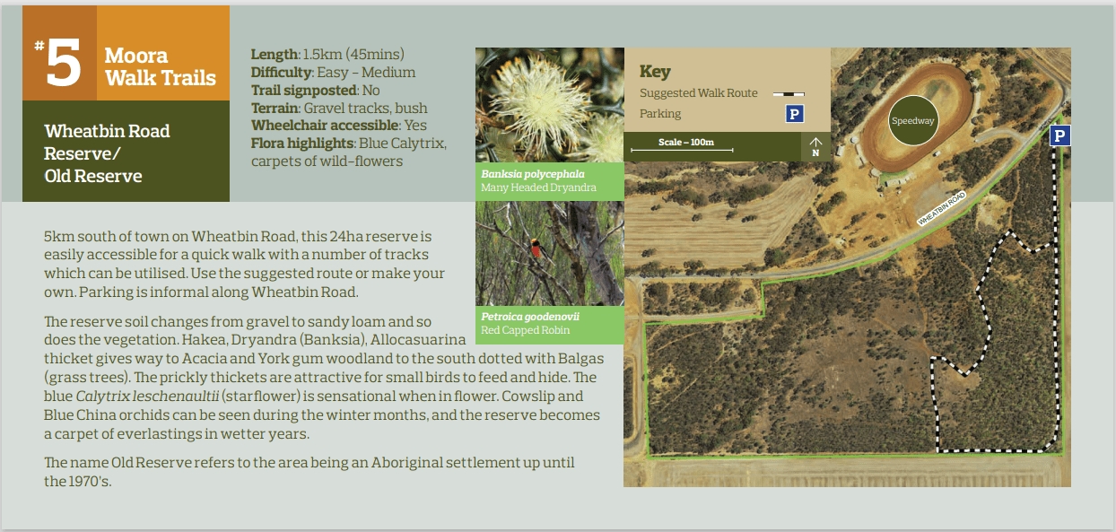 Business Listing for Moora Walk Trails: Wheatbin Road Reserve / Old Reserve Attractions, Hikes, Trails & Wildflowers, Things To Do https://moora.com.au/documents/976/walks-in-the-shire-of-moora Additional Information Description: 5km south of town on Wheatbin Road, this 24ha reserve is easily accessible for a quick walk with a number of tracks which can be utilised. Use the suggested route or make your own. Parking is informal along Wheatbin Road. The reserve soil changes from gravel to sandy loam and so does the vegetation. Hakea, Dryandra (Banksia), Allocasuarina thicket gives way to Acacia and York gum woodland to the south dotted with Balgas (grass trees). The prickly thickets are attractive for small birds to feed and hide. The blue Calytrix leschenaultii (starflower) is sensational when in flower. Cowslip and Blue China orchids can be seen during the winter months, and the reserve becomes a carpet of everlastings in wetter years. The name Old Reserve refers to the area being an Aboriginal settlement up until the 1970’s. Features: Length: 1.5km (45mins) Difficulty: Easy – Medium Trail signposted: No Terrain: Gravel tracks, bush Wheelchair accessible: Yes Flora highlights: Blue Calytrix, carpets of wild-flowers Download the Walks in the Shire of Moora Eco Trails brochure here: https://moora.com.au/documents/976/walks-in-the-shire-of-moora Images Photo Moora Reserve 4 Chris Owen 1000x700 1 Screenshot 2024 04 02 145431