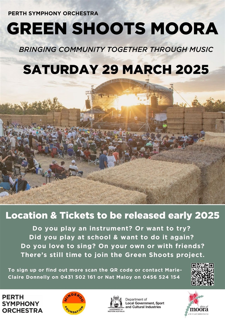 Business Listing for Moora Haybales Concert Events, Latest News and Happenings Additional Information Description: Perth Symphony Orchestra (PSO) and the Shire of Moora, with funding from the Department of Local Government, Sport and Cultural Industries, have joined together to bring you Green Shoots Moora. The Green Shoots program is based on the premise that many communities in WA have hidden musical treasures – individuals who once played a musical instrument, or are interested in learning to play one. The PSO-led program will bring together Moora and surrounds-based musicians from the community and schools to form ensembles, supported by a dedicated PSO musician who will help coach, mentor and teach. The program will culminate in a spectacular performance on 29th March 2025 that will feature the Moora Green Shoots ensembles, set alongside the Orchestra, in a ‘theatre’ made of hay bales. The Green Shoots program is designed to ultimately create sustainable musical groups that will continue beyond the year-long PSO residency to allow for future Moora performances – by the community, for the community. Images MOORA GREEN SHOOTS POSTER FINAL 1280x1811 Green Shoots Image 960x675