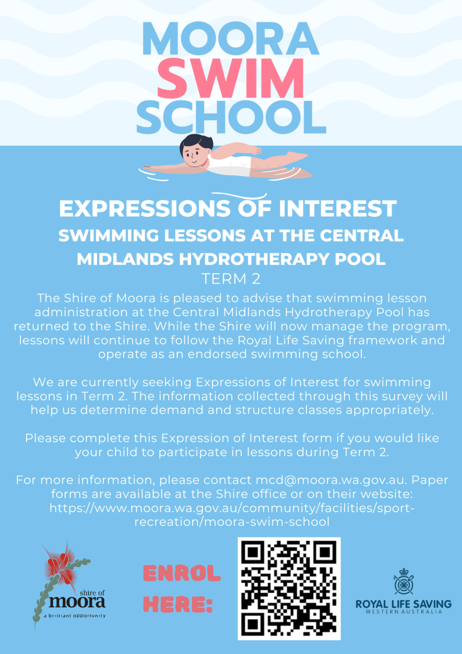 The Shire of Moora is pleased to advise that swimming lesson administration at the Central Midlands Hydrotherapy Pool has returned to the Shire. While the Shire will now manage the program, lessons will continue to follow the Royal Life Saving framework and operate as an endorsed swimming school.