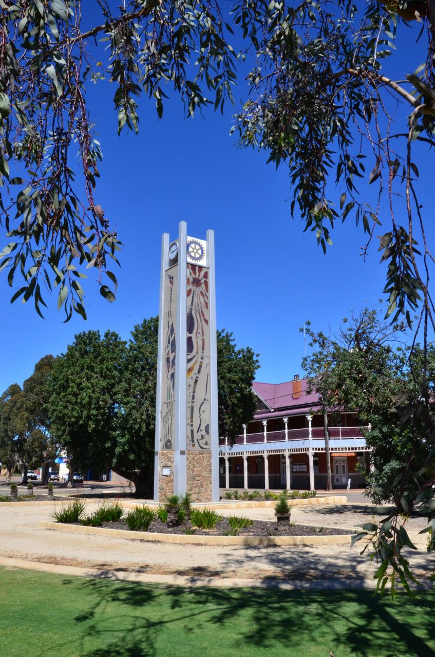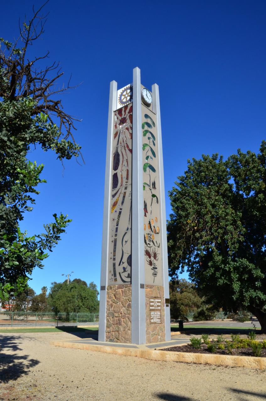 The original clock tower, an initiative by the Rotary Club of Moora, was originally erected in the late 1960’s to honor the early settlers. Refurbished in 2003 to celebrate the Centenary of Rotary, the tower now features stained glass panels on each side and is best viewed at night when the magnificence of the panels are revealed. The pictures in the panels are designs by local school children and were adapted by local artist Richard Apel, who also manufactured this outstanding structure.